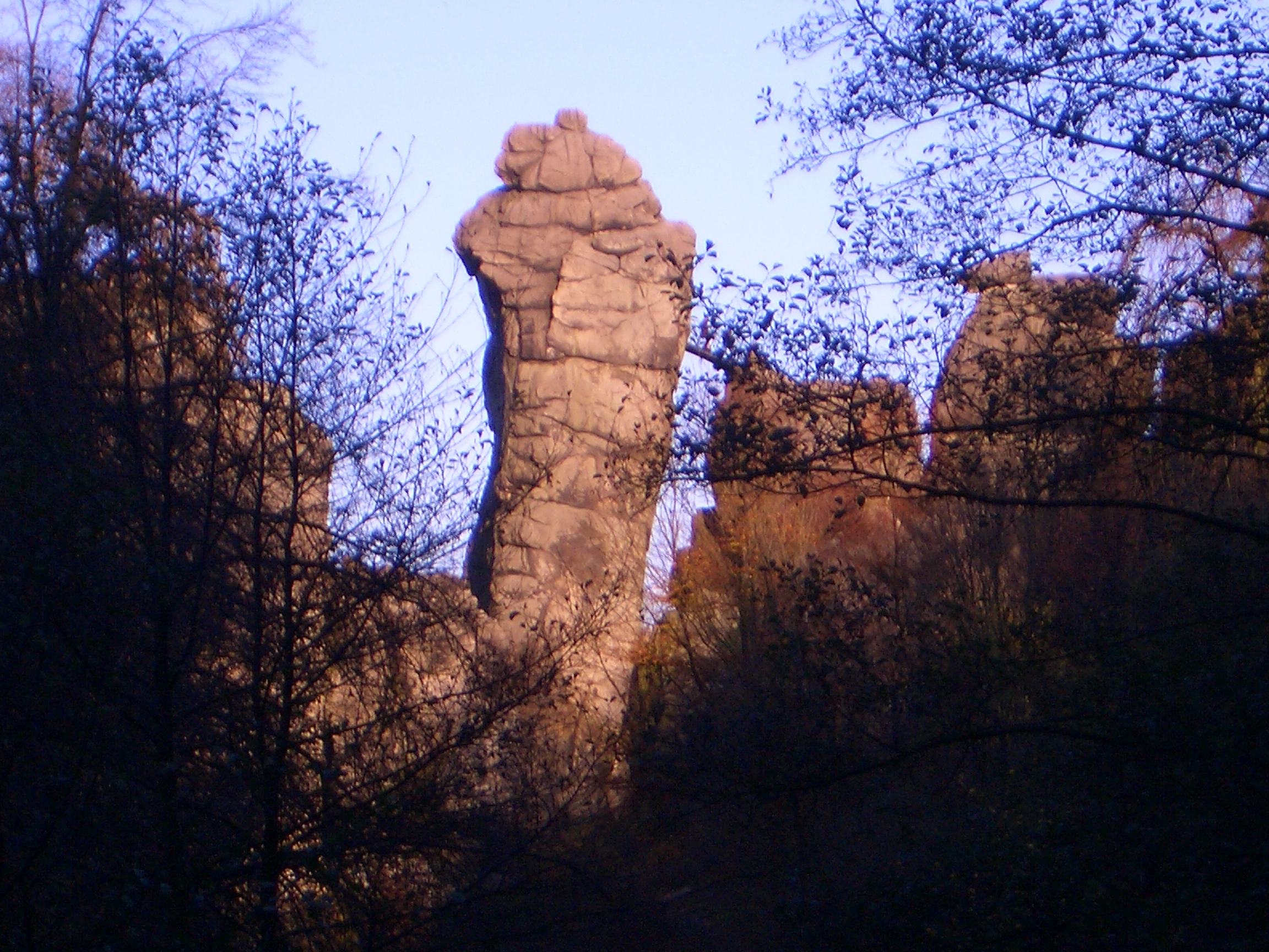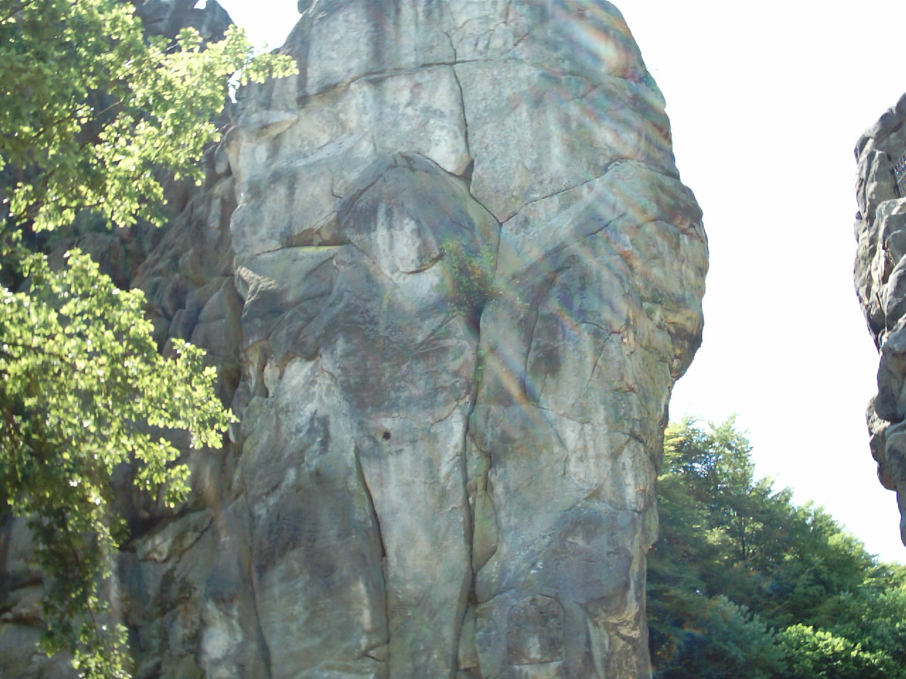 Wenn wir uns nun die "Rückseite" der Felsreihe der Externsteine anschauen, müssen wir uns rechts neben dem Hängenden, unterhalb des Wackelsteins durch den Durchgang auf den Weg Richtung Kreuzkrug begeben.