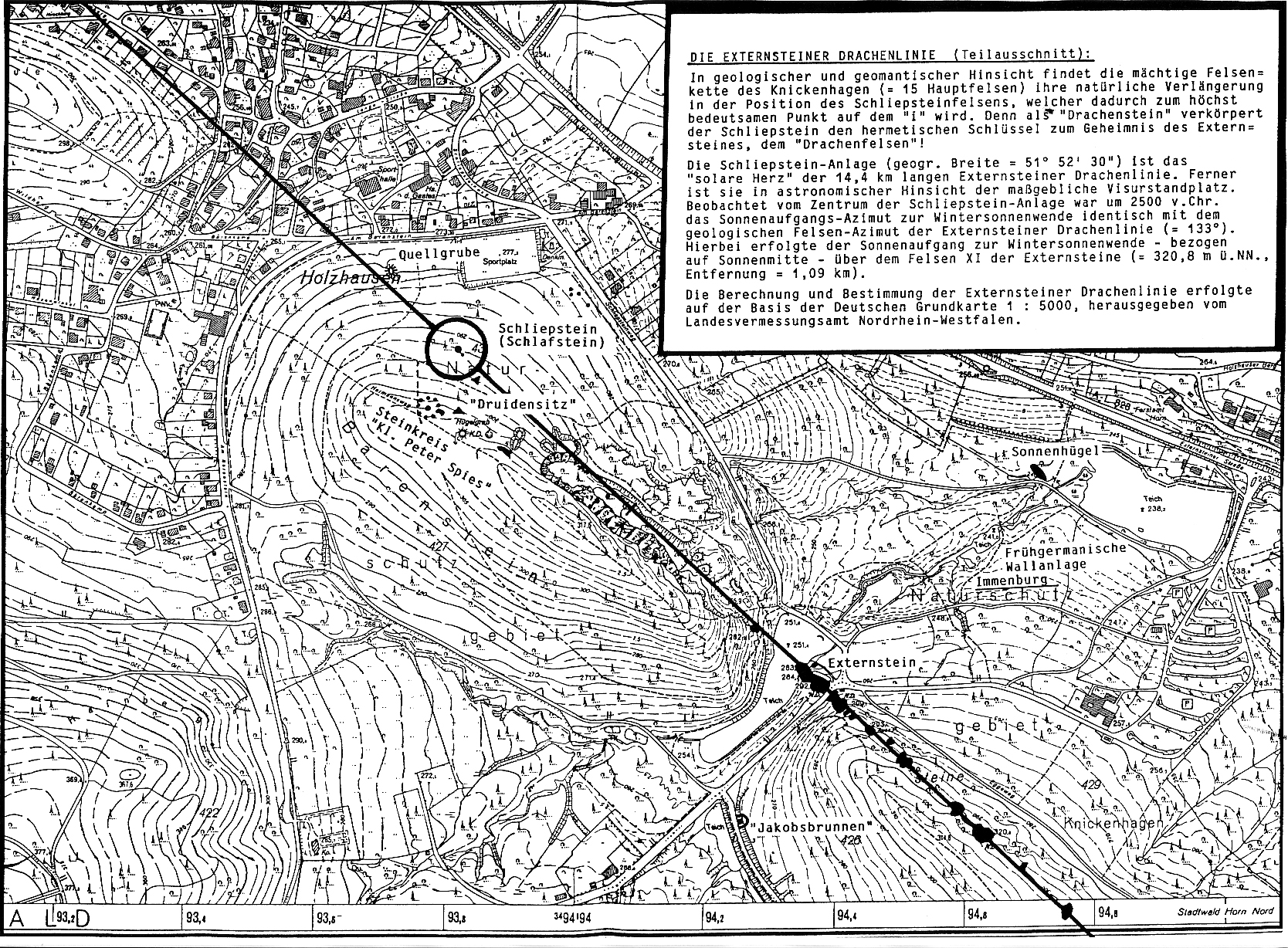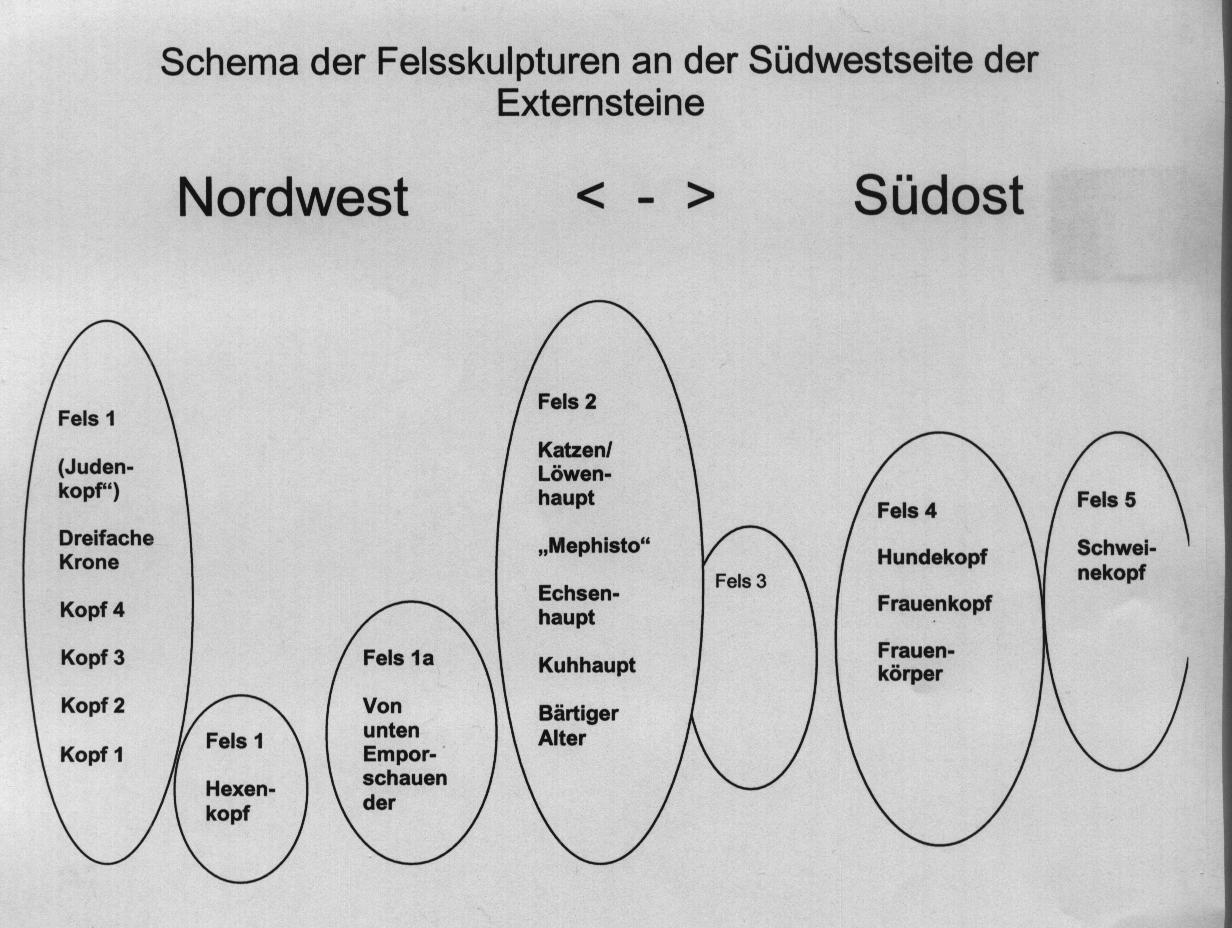 Güther Heinecke hatte uns mit seinen Arbeiten darauf hingewiesen, daß die Reihung der einzelnen Felsen der Externsteine einer astronomischen Ortung folgt: Sie befinden sich in einer südöstlich/nordwestlichen Linie.