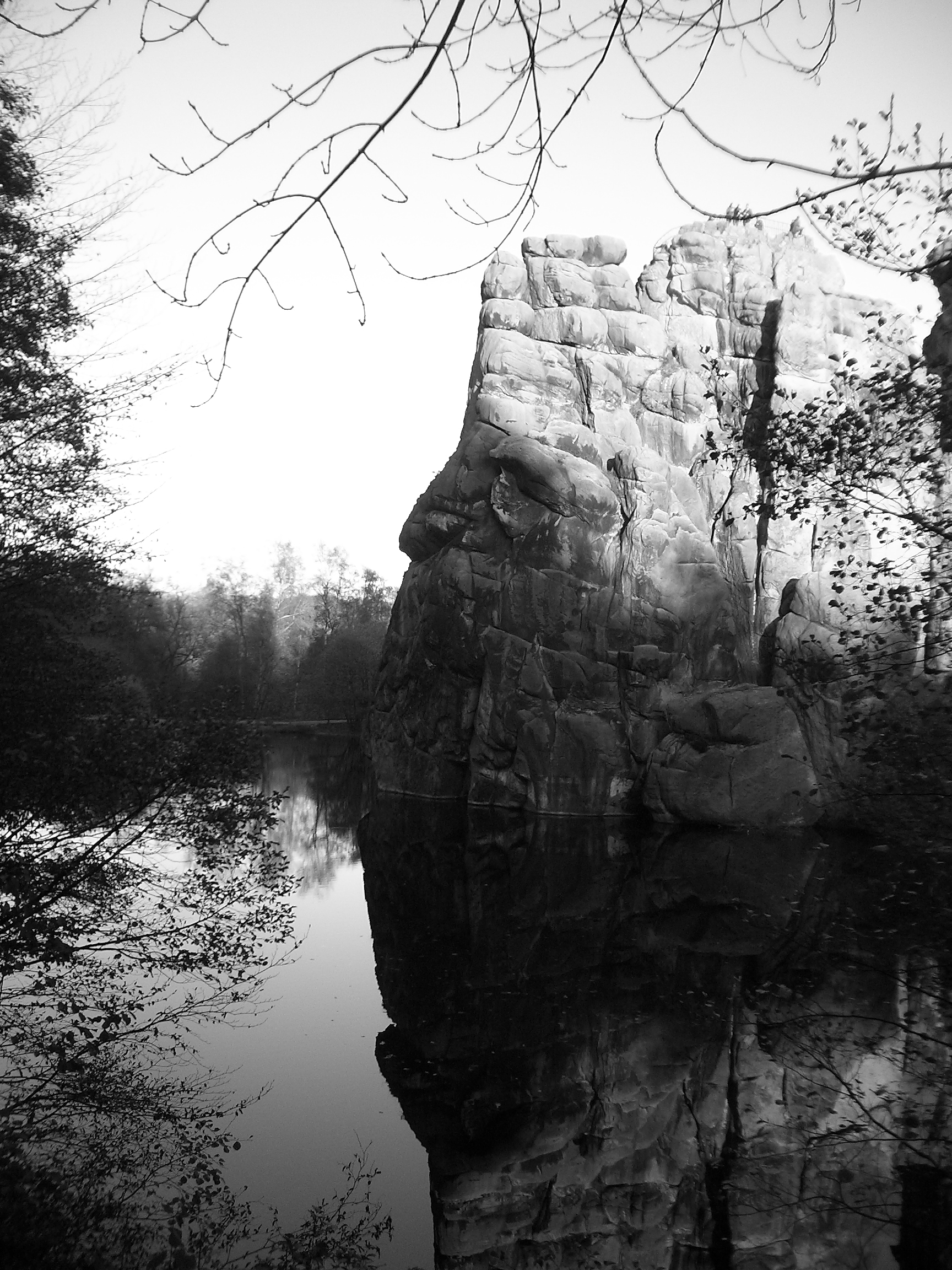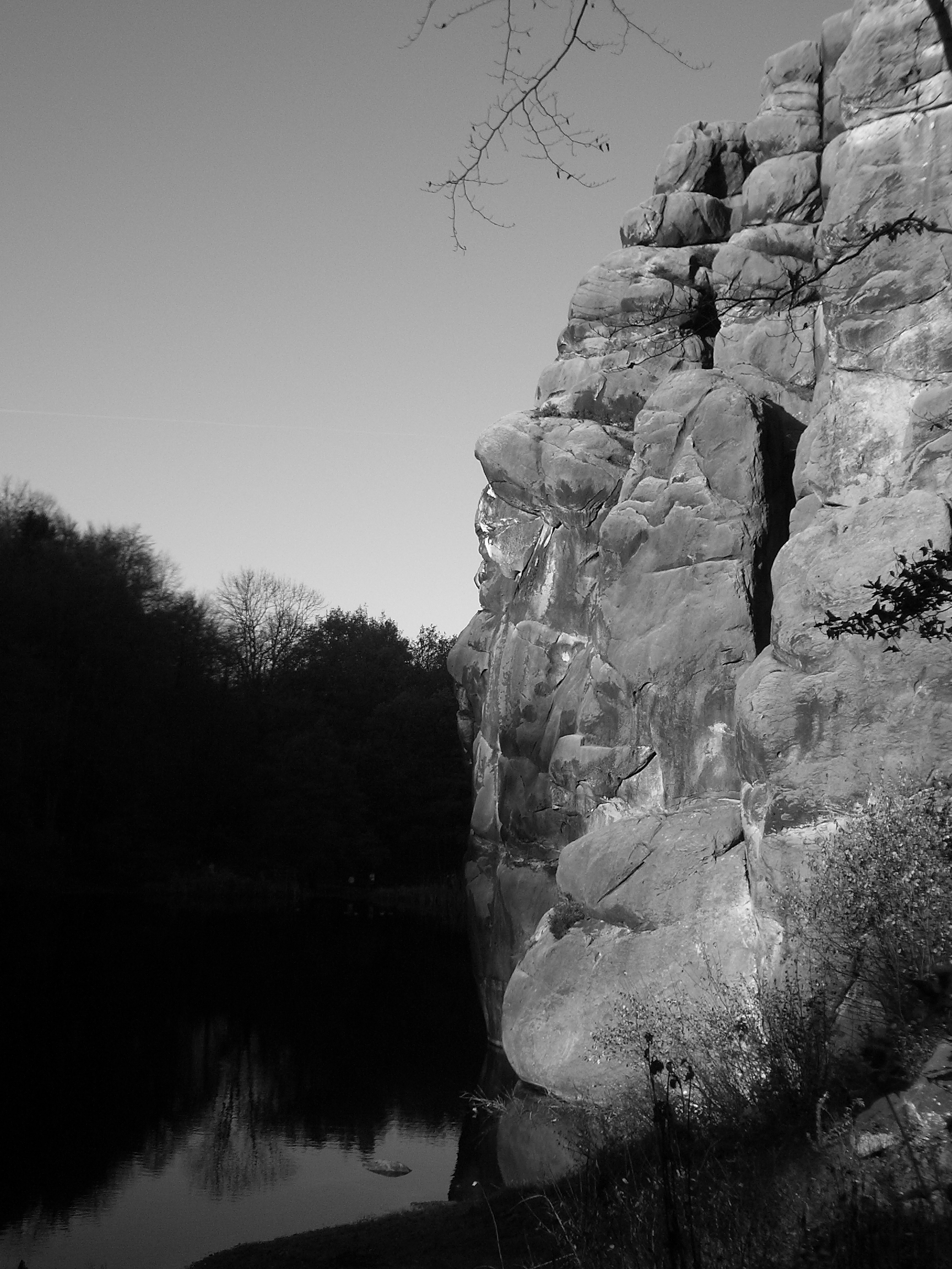 Jetzt schauen wir rechts vom Wackelstein bis zu jenem Felsprofil, das steil abfällt in den aufgestauten Teich.