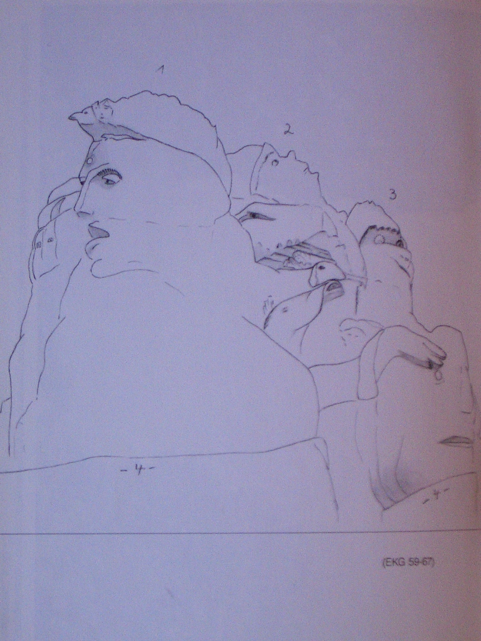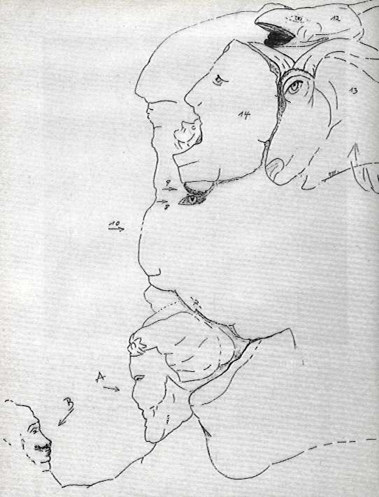 Und an der Wasserkante des Felsens 1 fungieren Teile dieser Kopfprofile zugleich als Bestandteile darüber- oder darunterliegender Gesichter.