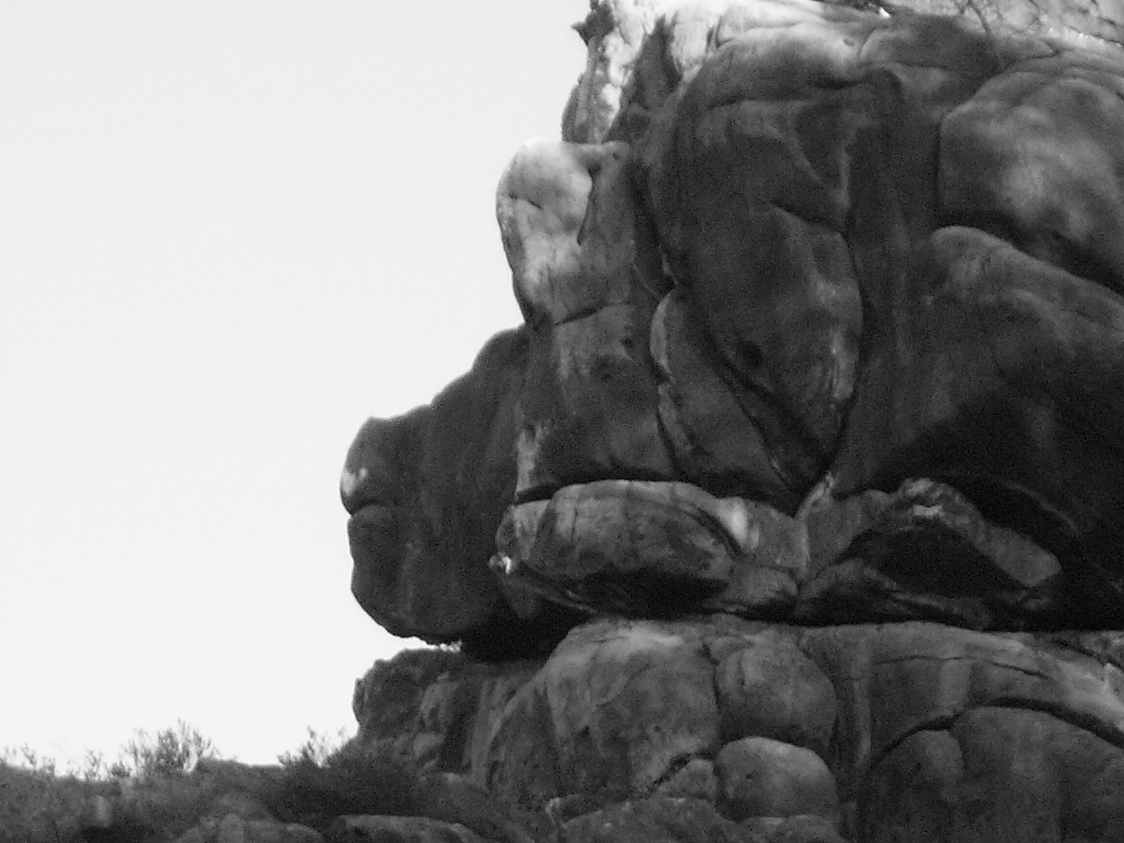 Es gibt kein detailliertes Gesicht, keine differenzierten Glieder, keine anatomisch nachvollziehbaren Strukturen. Aber die Haltung des Hängenden, die Wesensart seiner Körperlichkeit wird dargestellt. Die Agonie des sein Haupt senkenden, der zugleich zutiefst mit den Beinen in der Erde verfestigt ist und mit den Armen das All umfaßt - das ist es, was diese Felsskulptur deutlich verkörpert.