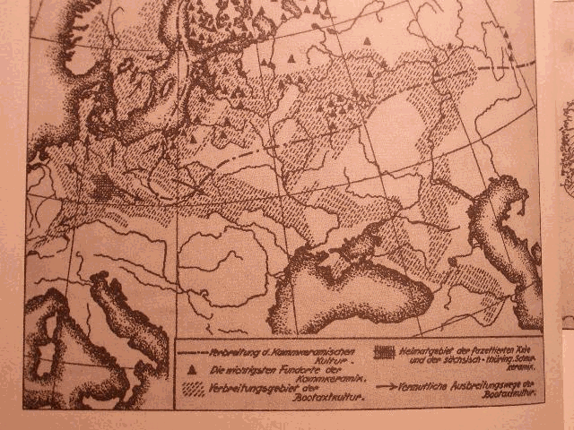 Auch diese Karte entstammt dem Werk von Lechler. Auch in den Dreißiger Jahren ließ sich nicht völlig verschleiern, daß die europäische Vorgeschichte Gegenstand widerstreitender kultureller Einflüsse war. Offen thematisiert wurde sie nicht, weil diese Erkenntnis im Widerspruch zum Homogenitätsgedanken der Volksgemeinschaftsideologie steht. Auch die Prähistorie ist ein Tummelplatz ideologischer Dogmen. Das gilt sowohl für die aus monotheistischer Sicht favorisierte Ex-Oriente-Lux-Theorie als auch für die Idee, die Mitteleuropa entstammenden Arier seien anderen Menschenarten überlegene Kulturstifter gewesen.