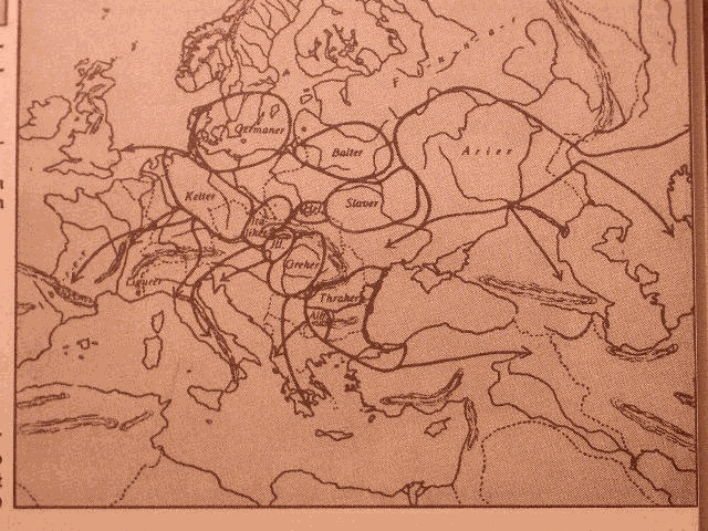 Die ganze Problematik der europäischen Urgeschichte spiegelt sich im Dogma der Authochtonie wider, das die völkische Vorgeschichtsforschung in den Dreißigern und Vierziger Jahren vertrat und in den entsprechenden Kreisen heute noch vertritt: Danach sieht man in Mitteleuropa eine ethnisch-biologisch konstante Bevölkerung seit der Alt-Steinzeit. Diese habe in mehreren Wanderungswellen außereuropäische Gebiete besiedelt und damit die Entstehung der großen Hochkulturen kausal hervorgerufen. Eine authochtone europäische Bevölkerung sieht man in Kontinuität von Megalithikum über Bronze- und Eisenzeit bis hin zu den historischen Germanen und Kelten. In der folgenden Karte ist diese eurozentrische Ursprungs- und Wanderungtheorie dargestellt. Sie entstammt, wie auch die darauffolgende Karte dem völkisch angehauchten Vorgeschichtsbuch "5000 Jahre Deutschland" von Jörg Lechler, aus dem Jahr 1937 (Verlag Curt Kabitzsch).